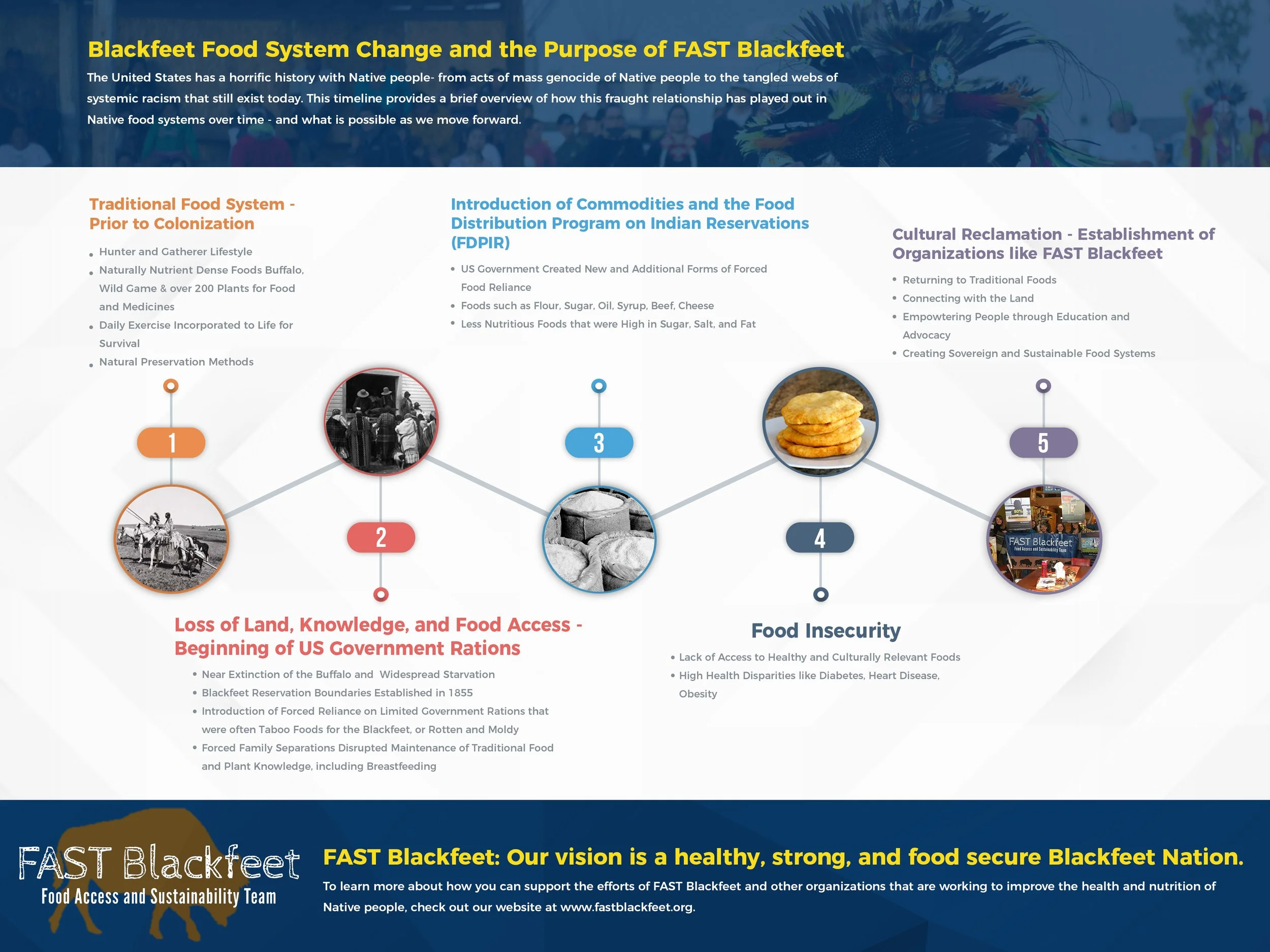 FAST (Food Access and Sustainability Team) Blackfeet is a nonprofit organization founded by a group of involved citizens who are dedicated to improving food security, providing nutrition education, and reclaiming & building food sovereignty within the Blackfeet Nation.